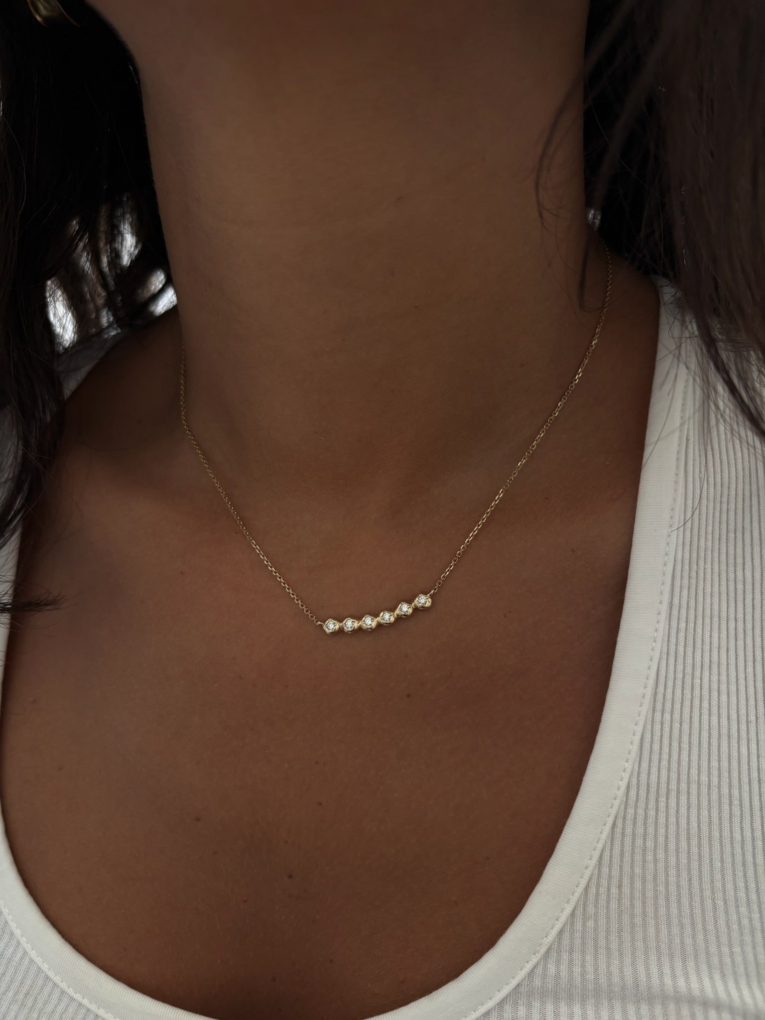 The Collective Bar will be the length of your chosen number of pendants. Each stone pendant is approximately 5mm wide. Stones will be set left to right.