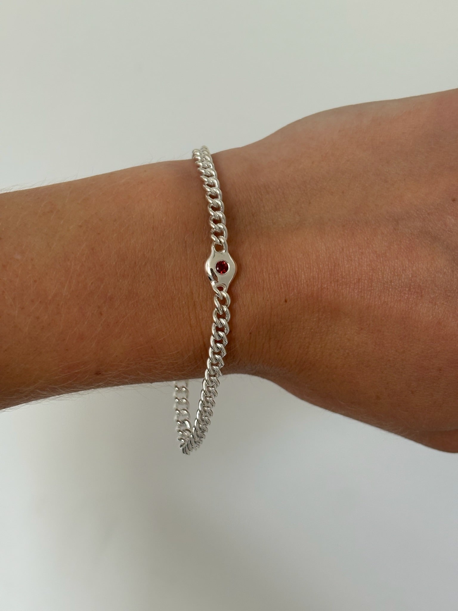 Sterling Silver. Pebble pendant is approximately 5mm and features a 3mm round stone of your choice, fixed into a 4mm curb chain. Birthstone Details/ Model wears this piece with a flush stone setting. If you select a custom length, please specify your preferred length in the summary box at checkout. We advise measuring the length to ensure the perfect fit. Sizes above 21cm will incur an additional fee for the additional metal.