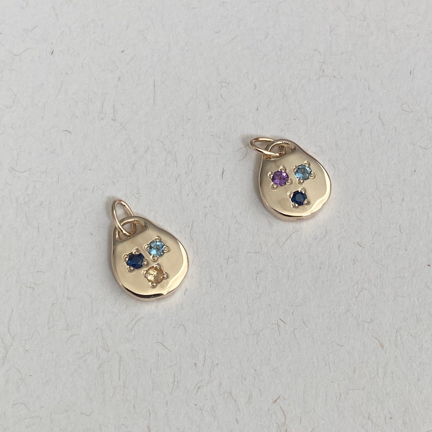 Solid 9k Yellow Gold with up to four 2mm natural stones of your choice 12mm x 10mm pendant, attached to a 5mm link Birthstone Details/ Please refer to our pendant sketch to see where stones will be placed. If you would like them in a specific location, please make a note of this in the special requests box in the cart. If you have an existing Linden Cook fine chain with an oval link on the end, this pendant should slide on to it. If you are adding to a gold plated necklace, the colour of the pendant may vary slightly to your piece. Add an Impression pendant to your piece here.