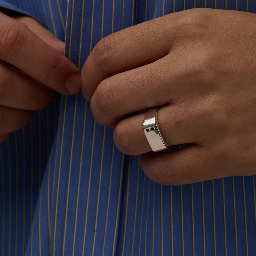 Sterling Silver with up to two 1.5mm round birthstones of your choice. Signet face is approx 7mm x 13mm with rounded edges. The band width tapers down to 3mm wide at the back. The first stone will be placed in the bottom left corner. If we are setting two stones, please specify whether you would like a horizontal or vertical. Refer to sketch for stone placement example. Birthstone Details/ Please use our Ring Size Chart here if you need assistance finding your ring size.