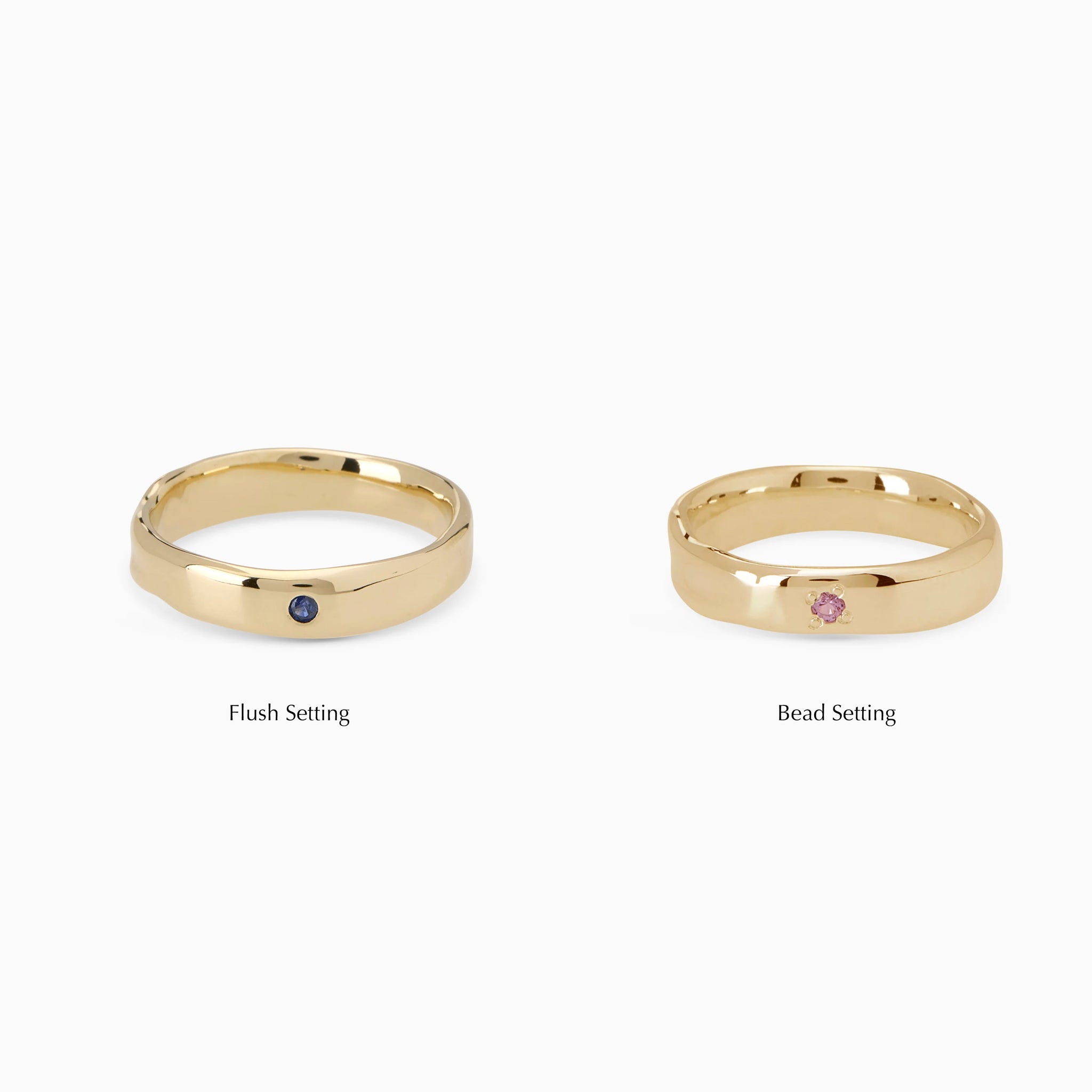 Solid 9k Yellow Gold with up to five 2mm round birthstones of your choice. Band width 3-4mm. Birthstone Details/ Please use our Ring Size Chart here if you need assistance finding your ring size.