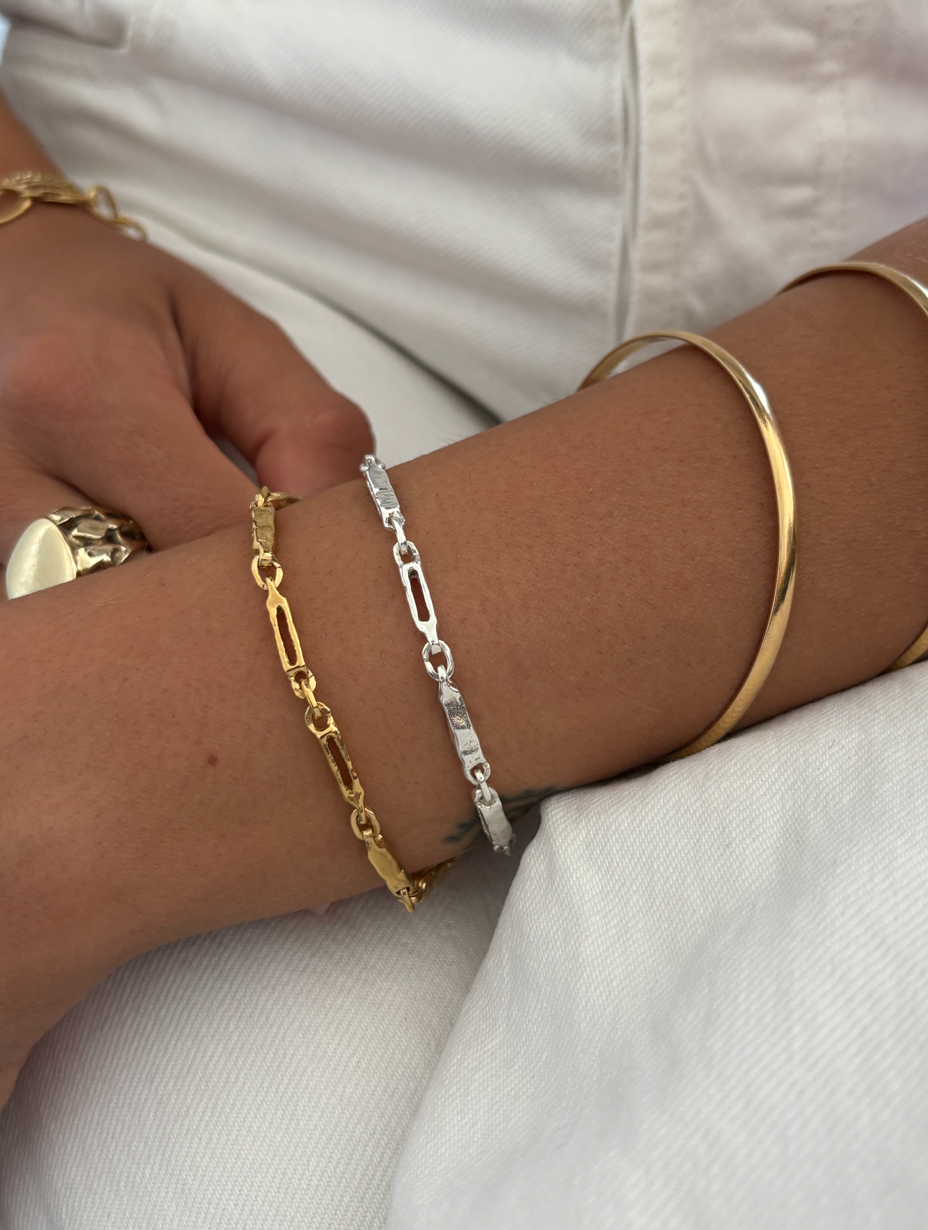 Sterling Silver with 18k Gold Plating. 4mm hammered bars. If custom length is selected, please specify the length you would like in the summary box at checkout. All gold plated pieces are electroplated in a 2 micron layer of 18k hard gold plating, this ensures a higher quality finish for longer lasting wear.